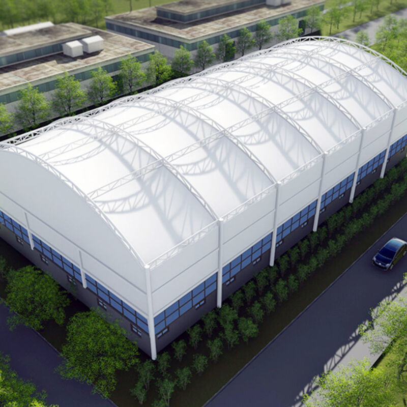 This PVDF building membrane has standard thicknesses 1.0mm to 1.03mm, widths 1000mm to 1800mm and lengths 50m 100m. Customizable colors are offered. It boasts excellent weather UV resistance self cleaning high strength flame retardancy and heat insulation, and is workable for stadium roof wall and tension membrane structure.